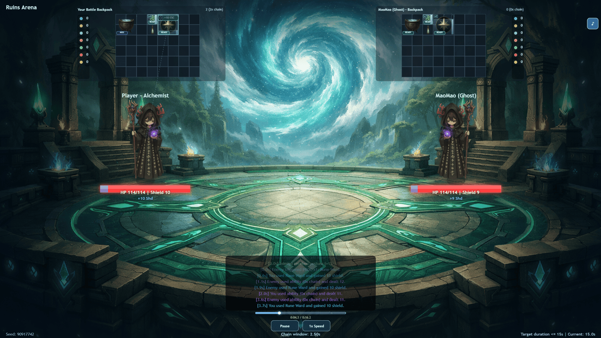 Buy weird gear, fit it into a real grid bag (rotation, footprints, collisions), and break the arena by chaining activations through adjacency, timing, and resources. Then step into the ring and watch the duel resolve in real time.